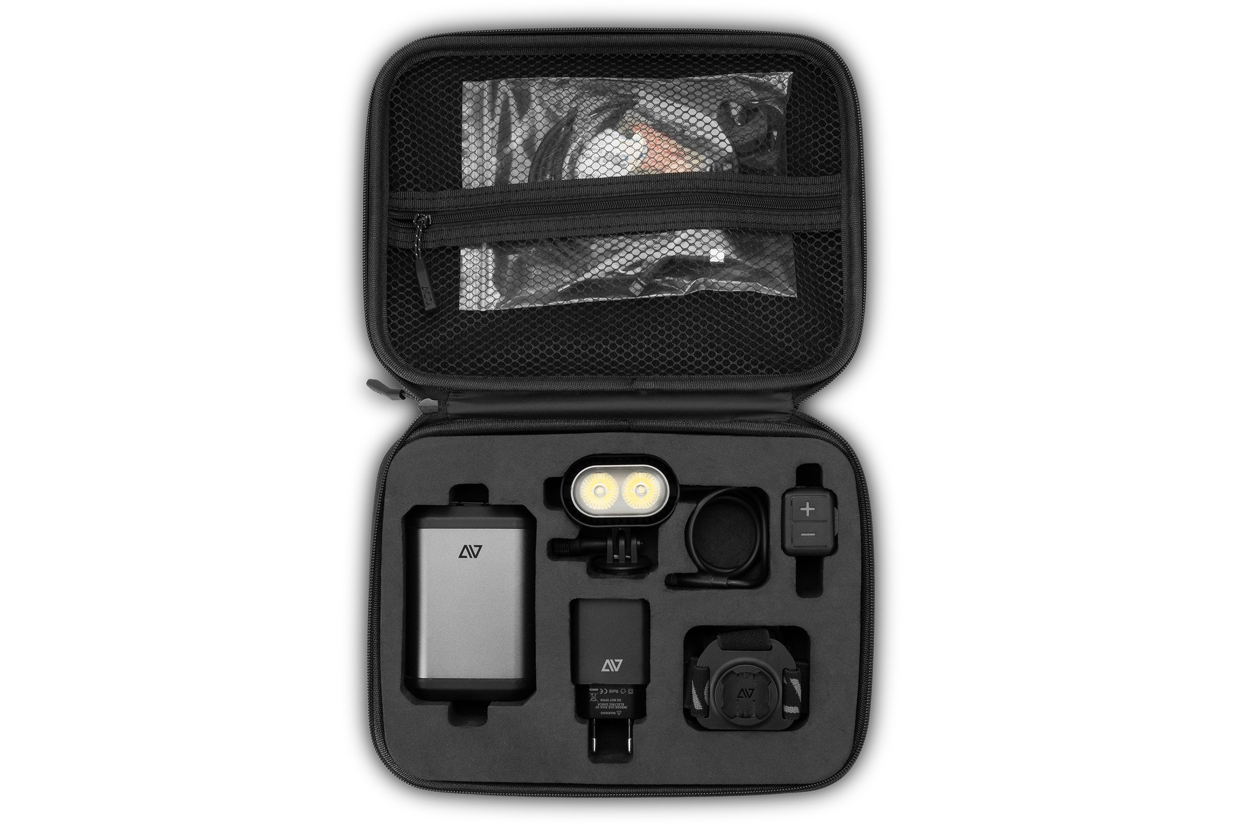 With up to 3000 lumen output and designed specifically for mountain biking and gravel riding, the ACID Outdoor LED Light HPA 3000 with X-Connect is capable of turning night into day. Rugged aluminium construction conforms to IPX6 for protection against even high pressure water from any angle. A 37Wh powerbank, fully chargeable in just 3.5 hours with the included 20W USB-C charger and cable, provides up to two and a half of run time on full power, and well over 42 hours on the ultra low setting. Power settings can be easily changed with the included remote and the powerbank can also be used to charge other devices, such as phones and watches. The mounting system is extremely adaptable and GoPro-compatible. Included mounts facilitate attachment to a helmet and a headband. A 1000 mm ACID X-Connect extension cord allows connection to the power bank. And all the included accessories fit into a neat foam core carry case, to keep everything to hand.
