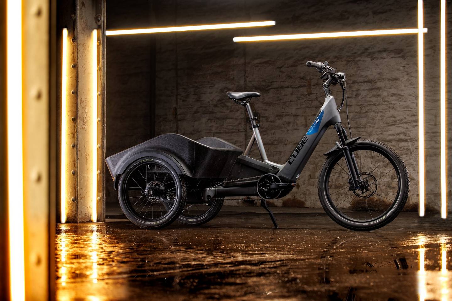 "The easy handling of an ebike paired with the cargo hauling capacity of a cargo bike: CUBE's Concept Dynamic Cargo combines the best of both worlds and is one of the highlights of the DI.A 2022. It's all made possible by an innovative tilting mechanism, allowing the front part of the bike and the rider to lean into corners while keeping the loading area upright with both rear wheels retaining maximum traction on the ground. An artfully integrated differential ensures that both wheels can be driven independently of one another by the Bosch Performance Line CX motor, offering plenty of assistance. The dynamic handling this results in completely redefines tricycles, so much so that you'll soon forget you're riding a cargo trike. Compared to some other cargo bike concepts, the front wheel is always visible, which makes it easy to manoeuvre around obstacles, and the Concept Dynamic Cargo retains this intuitive handling even when it's loaded. This makes the CUBE Concept Dynamic Cargo the ideal ebike for cargo bike newbies."