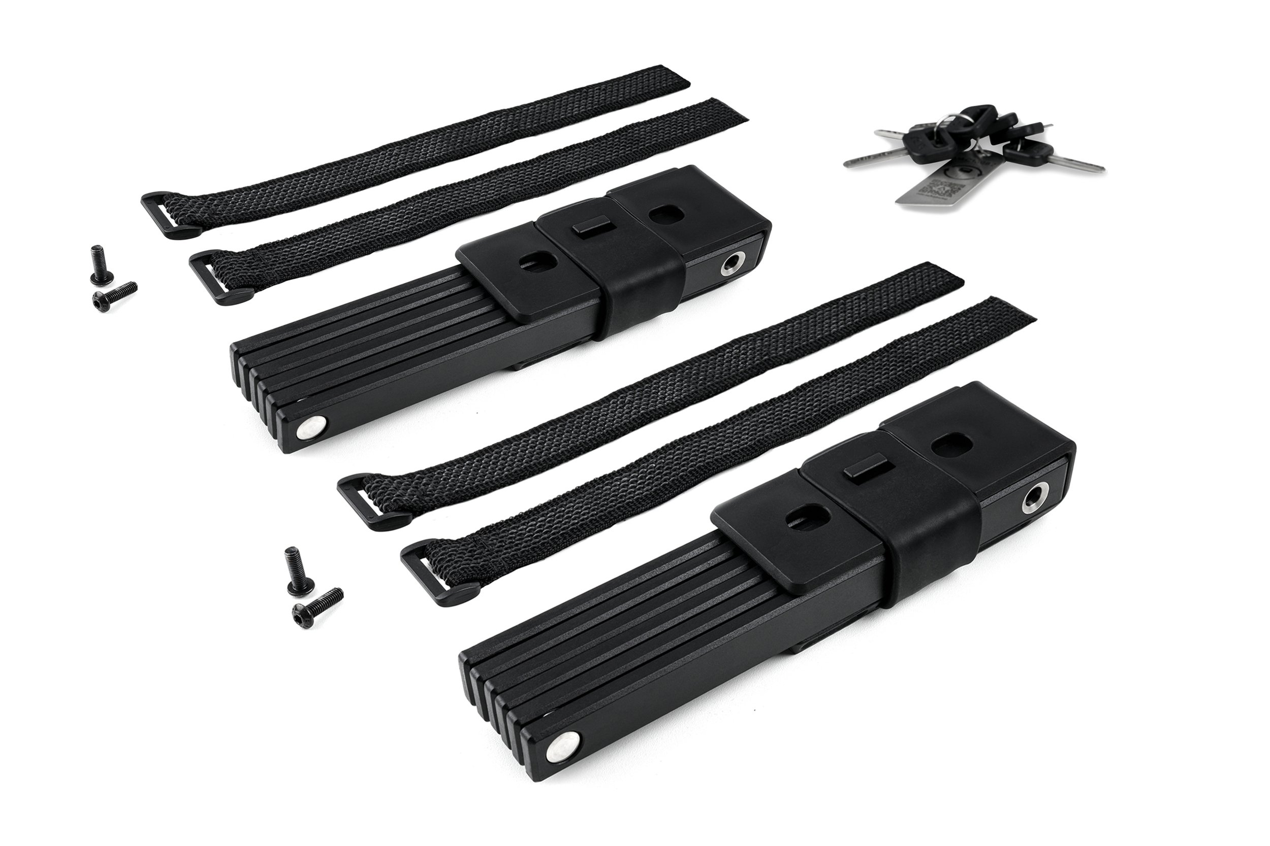 The RIGID 100 PURE TWIN PACK comes with two high-security folding locks, two brackets and six keys. Constructed from high-performance, hardened stainless steel and certified as meeting the rigorous ART1 theft-prevention standard. A strong spring-loaded bolt makes the locks incredibly easy to use and close securely. The slim, elegant design doesn't just look good – it also shaves weight from the 100 cm folding lock to make it practical. Fits to virtually any bike. A low-profile side-opening bracket is simple to screw on in a range of positions or attach using the anti-slip touch fastener. Premium-quality materials and precise workmanship will fend off the most determined theft attempts and stand up to extreme weather conditions. Perfect protection, wherever you are.