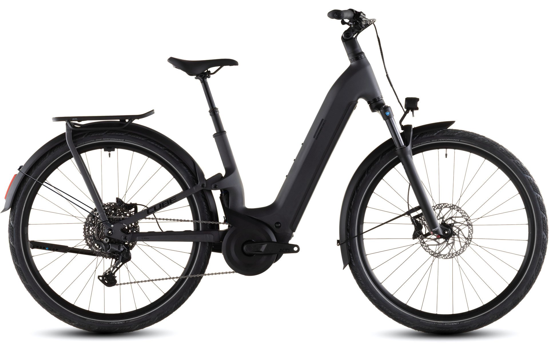 Combining everything we know about full suspension and rugged touring bikes in a single frame, the Kathmandu Hybrid ONE11 HPC from CUBE represents a new breed of Bosch-powered adventure bikes. The accessible Easy Entry design makes use of a sophisticated High Performance Carbon front end, housing a powerful Bosch CX drive and 800Wh PowerTube battery. There's 100mm of rear-wheel travel from an incredibly neatly sited trunnion-mount shock, while the IC 3.0 rear carrier is incorporated into the aluminium rear triangle. Integrated Cable Routing complements the frame's clean looks, the derailleur hanger is UDH-compatible, and a chain guard is fitted as standard. It's all there so that you can ride further... in comfort.