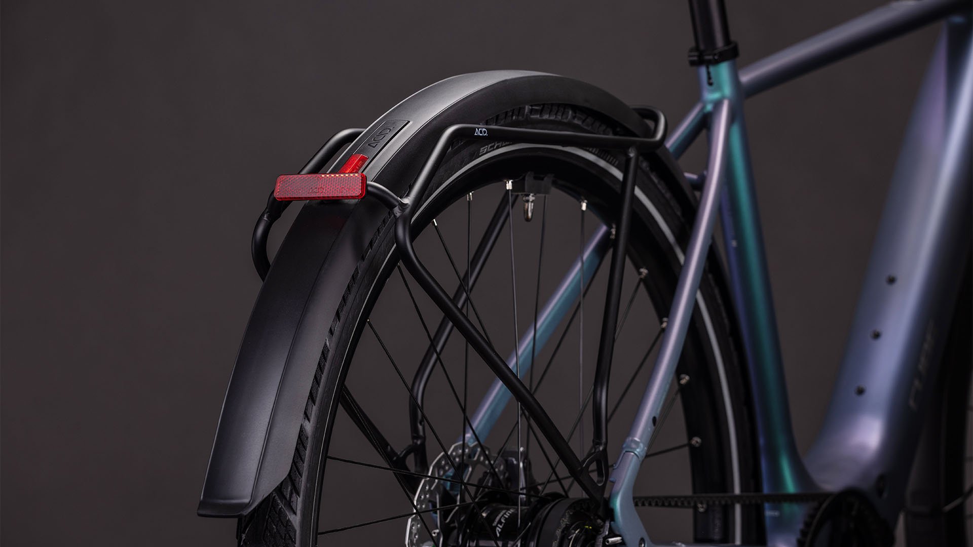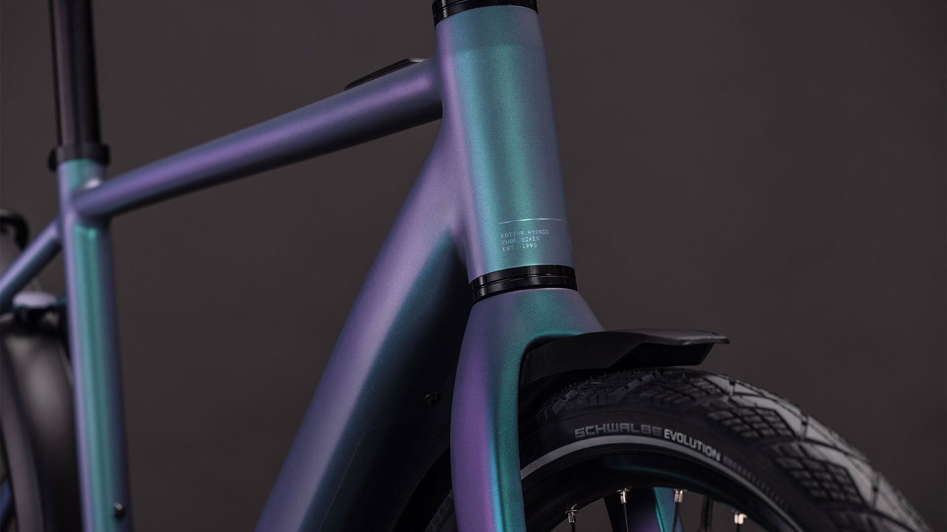 So sleek and understated is the Editor Hybrid FE's frame, at first glance it barely looks like an e-bike. Lightweight, durable aluminium construction with Smooth Welding at the main tube joints creates an elegant frame, while the full carbon fork is both light and strong. We integrated the cables to complement the frame's clean lines, and the 400Wh battery is built into the down tube to save space and weight. There's a versatile, rugged rear carrier and an optional front carrier for carrying your belongings. And we included full mudguards, a bright lighting set and a practical kickstand, so you've got everything you need.