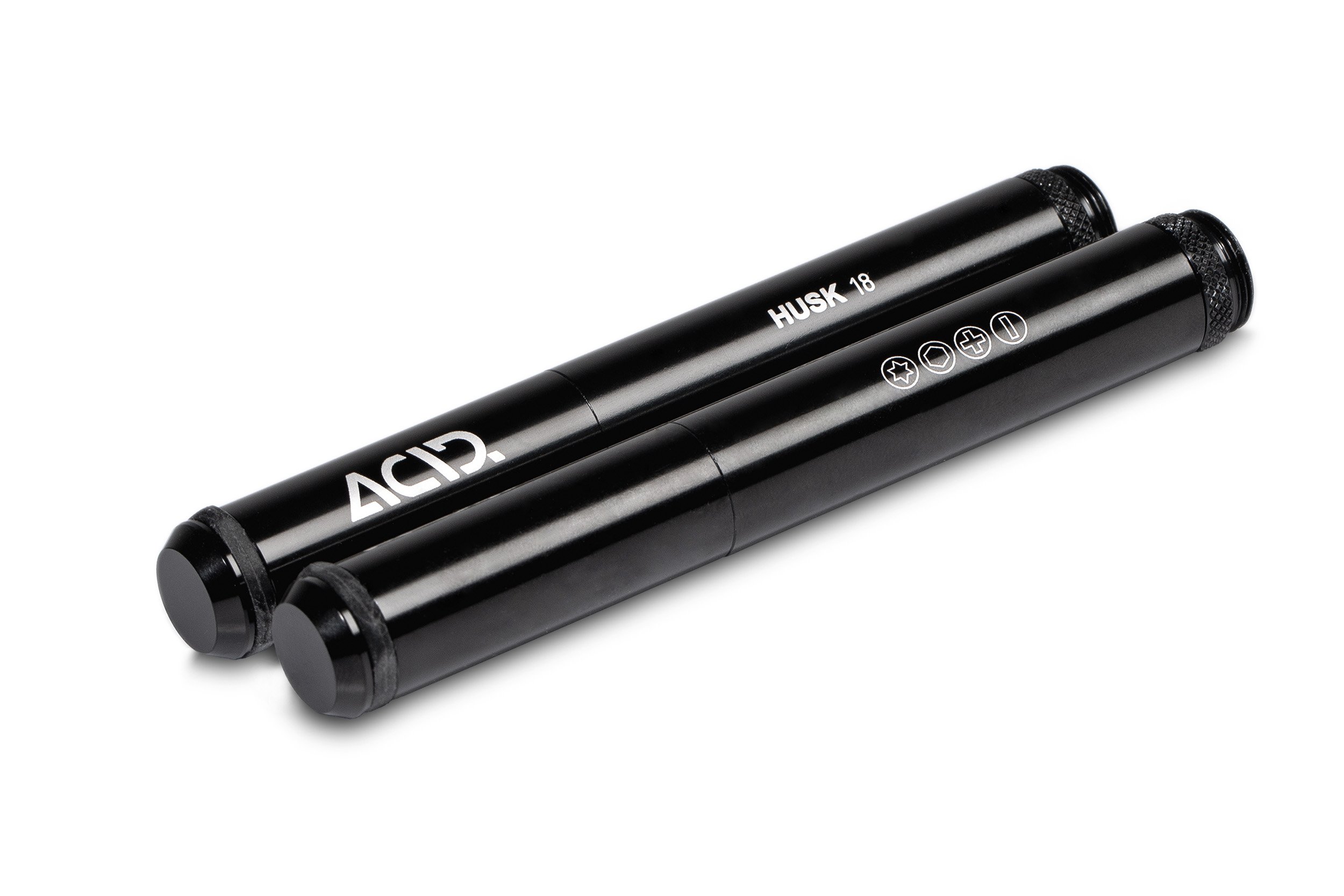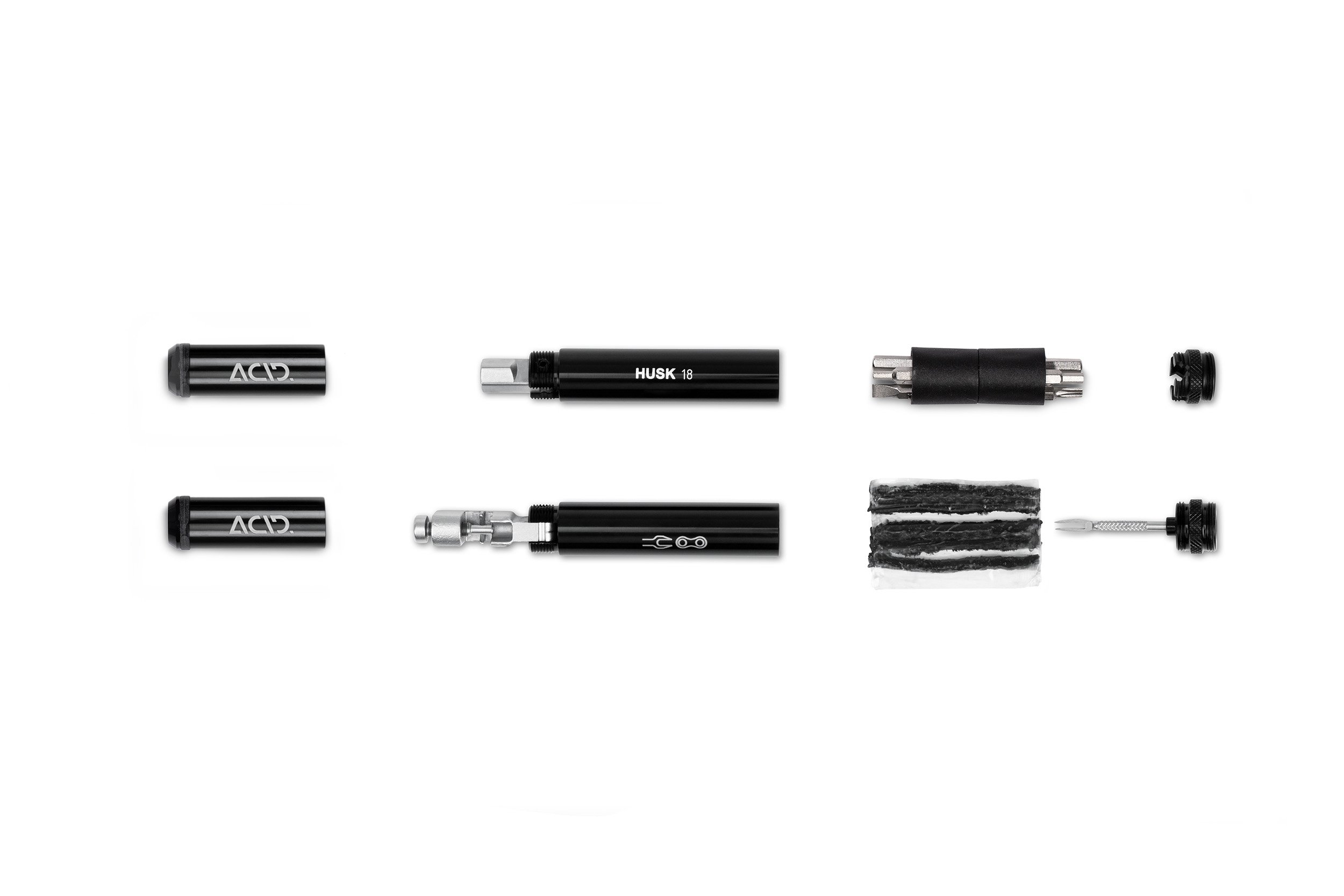 The ACID Multi Tool HUSK 18: a premium yet compact tool kit in a super-cool design. The two metal tubes fit snugly in your hand. Inside, you'll find 18 functions all neatly protected against dust and dirt. The chain tool and bit extension open up 90° for better leverage. The two HUSK 18 tubes can be hidden away inside your handlebars using the ACID GILink for HUSK or mounted to the bottle cage using the ACID Frame Mount.