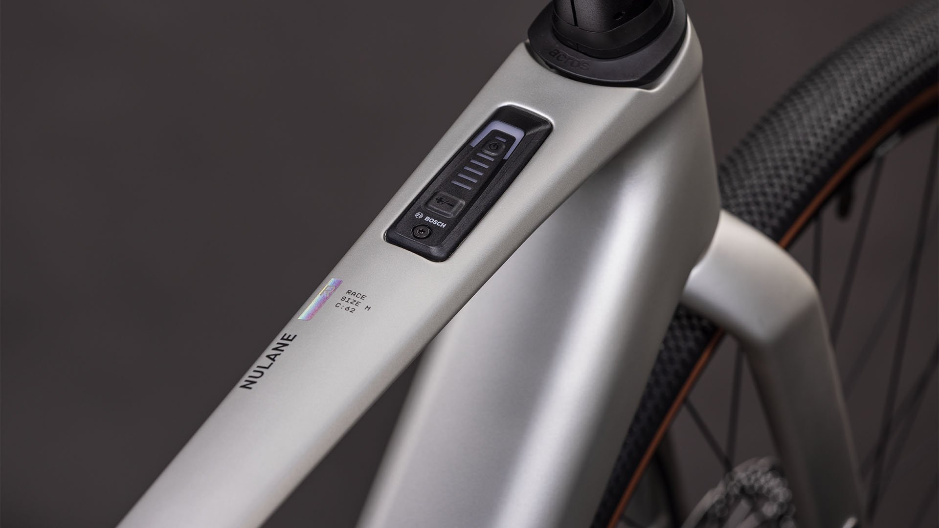 El cuadro de carbono de la Nulane Hybrid C:62, inspirado en nuestra experiencia en la construcción de bicicletas de grava ligeras, rápidas y resistentes, presenta curvas orgánicas y un aspecto limpio que oculta intenciones serias. Hay espacio libre para neumáticos de hasta 50 mm, incluso con guardabarros montados. Hemos añadido puntos de anclaje para portaequipajes tanto en la parte trasera como en la horquilla completa de carbono, para que puedas enfrentarte fácilmente a los desplazamientos entre semana o a una excursión más larga. La unidad de control del sistema de propulsión Bosch está incorporada en el tubo superior —con un minimando en el manillar— y puedes añadir una batería de refuerzo PowerMore de 250 Wh al cuadro para ampliar la autonomía. Y, en el aspecto técnico, la abrazadera de sillín oculta, la guía de cadena de montaje directo, la interfaz de pata de cabra de montaje plano, el tren trasero Boost y la compatibilidad UDH la convierten en una bicicleta preparada para el futuro por todos los motivos.